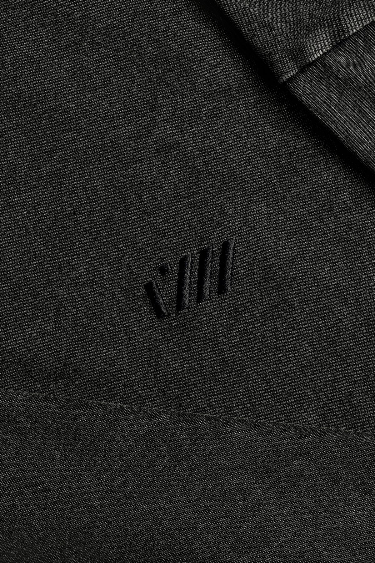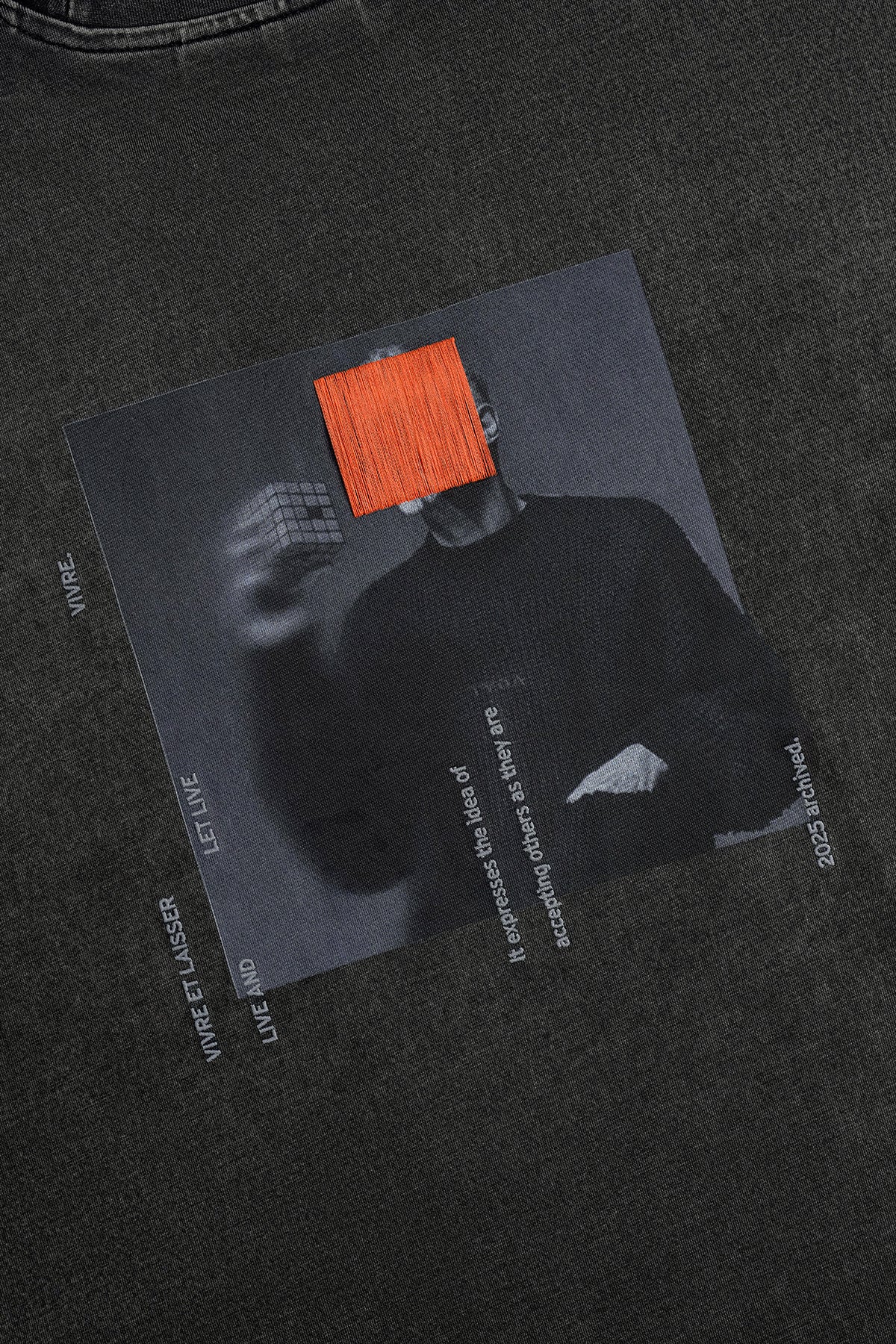 resolution digital print, serving as the visual foundation. Over this surface, a specially engineered embroidery is applied, with overlapping threads that introduce depth and tactile contrast. A vivid orange embroidery element is precisely placed as an emphasis detail, creating a focal point that disrupts the monochrome composition. The design is completed with finely executed embroidered typography layered on top, reinforcing the sense of dimension and craftsmanship. Each element is deliberately built in sequence, resulting in a rich interplay of texture, material, and technique that elevates the garment beyond a standard printed piece.